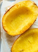 Here’s the best way to cook spaghetti squash! Cut it in half, scoop out the seeds, rub a little olive oil and salt on the inside, and roast in the oven cut-side down. No fuss, no mush, just tender and delicious spaghetti squash! Recipe as written yields 2 baked squash halves (1 squash total); you can easily bake 4 halves (2 squash) at a time on a large baking sheet.