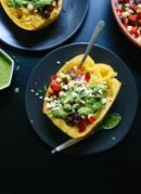 Roasted spaghetti squash topped with your favorite Mediterranean ingredients and pesto! This healthy vegetarian dinner recipe will make everyone happy. Recipe yields 4 servings (4 stuffed spaghetti squash halves).