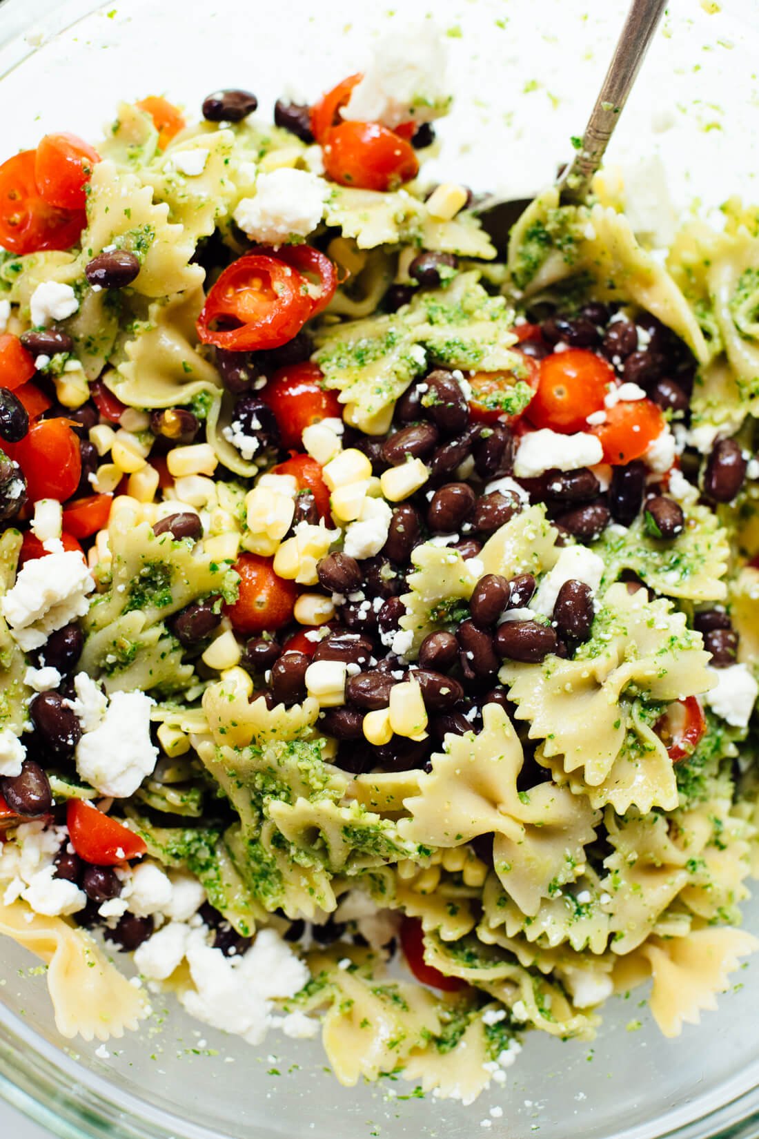 This healthy pasta salad features bold summer flavors, including tomatoes, corn and black beans tossed in spicy, fresh pesto! It’s a great vegetarian side dish for potlucks and barbecues. See paragraph above for variations and substitution suggestions! Recipe yields about 8 cups salad, which is enough for 4 main or 8 side servings.